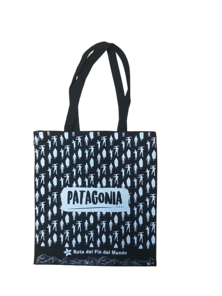 Bolsa negra estampada por ambos lados . Motivo Patagonia, ruta del fin del mundo. Material krea . Medidas ancho 36 cms x alto 39,5 cms. Alto total con mangos 66 cms.