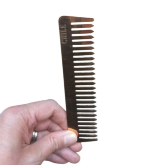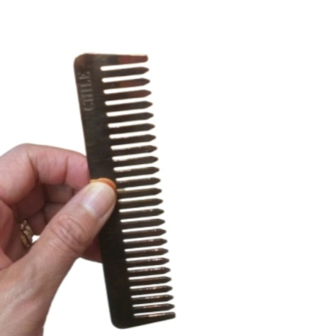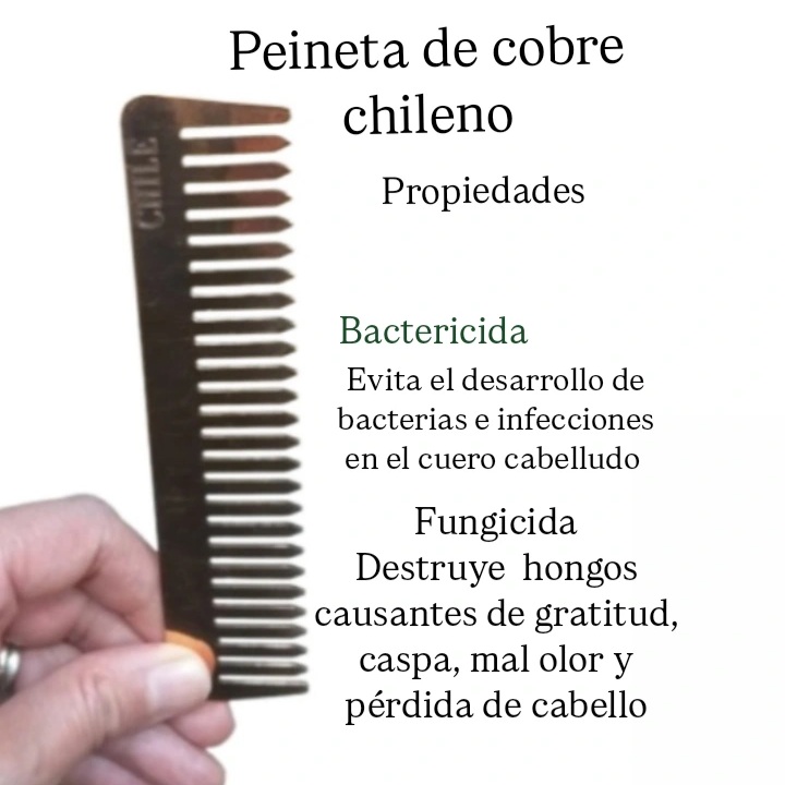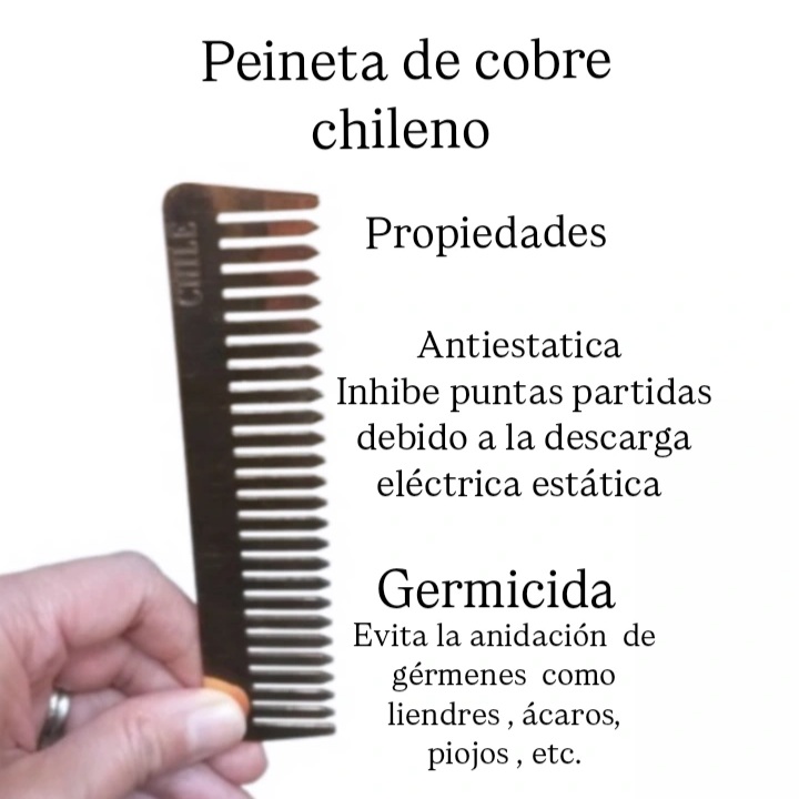 Peineta de cobre chileno. Medidas 14,7 cms x 3,5 cm. Aprovecha las propiedades del cobre para la salud. En el caso de la peineta de cobre es Bactericida ( evita el desarrollo de bacterias e infecciones en el cuero cabelludo ) , Fungicida ( destruye hongos causantes de grasitud , caspa , mal olor y pérdida del cabello ) , antiestatica ( inhibe puntas partidas debido a la descarga eléctrica estática ) , Germicida ( evita la anidación de gérmenes como liendres, ácaros , piojos , etc ).